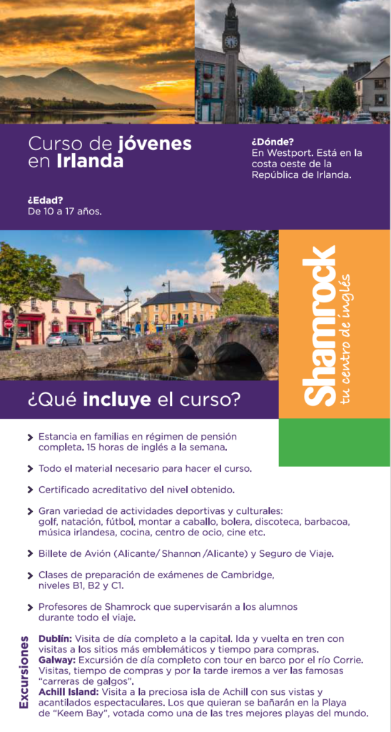 - Excursiones: Dublín, Achill Island, Galway, Croagh Patrick, Centro de Ocio etc.
